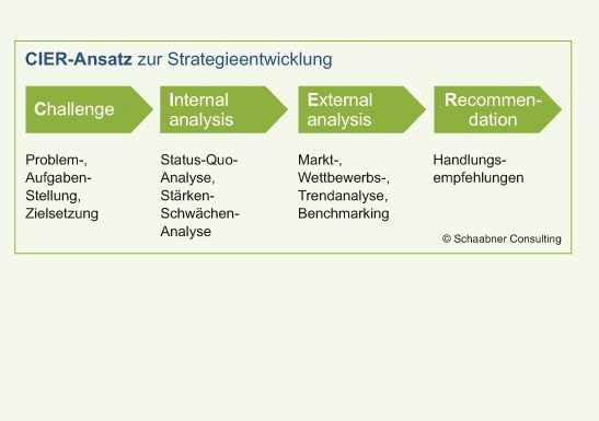 Jede Aufgabenstellung verlangt eine individuelle Lösung, die auf die definierten Ziele abgestimmt und den jeweiligen Besonderheiten Rechnung trägt. Dabei folgen wir in der strategischen Arbeit dem CIER-Ansatz.